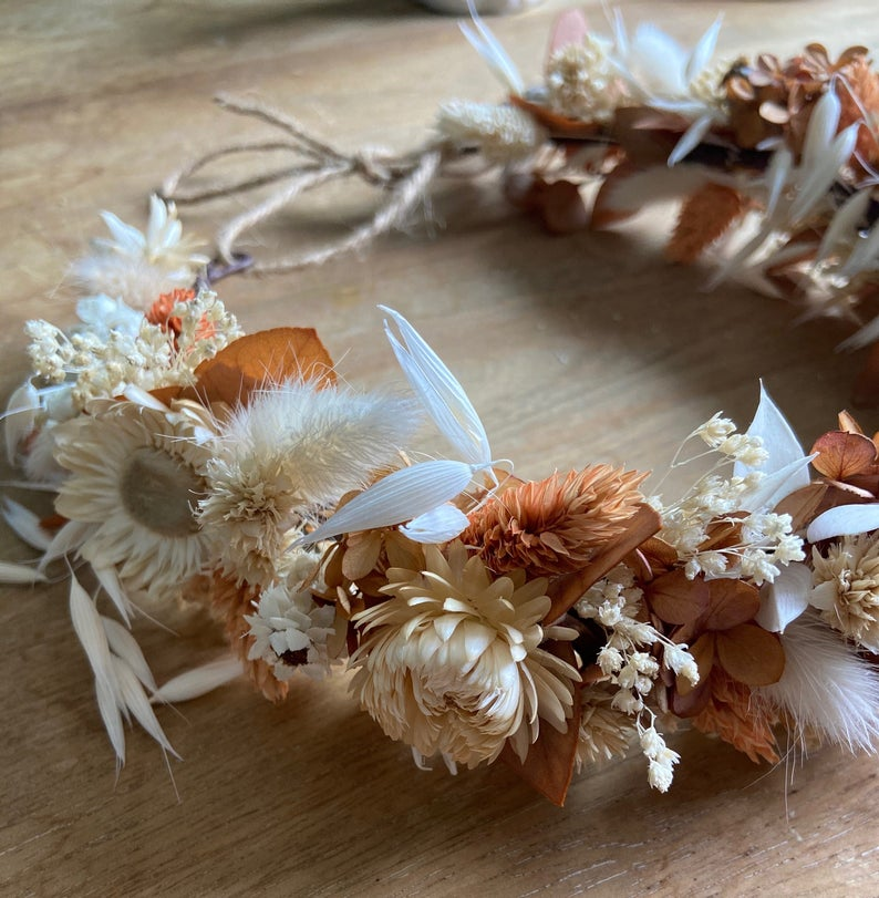 Les fleurs séchées peuvent être le complément idéal pour la coiffure de la mariée : sous la forme d’une couronne de fleurs, ou en peigne pour accompagner un beau chignon. Elles vous apporteront une touche bohème et décontractée. Retrouvez des idées pour le choix de votre accessoire de cheveux pour votre mariage dans cet article :
