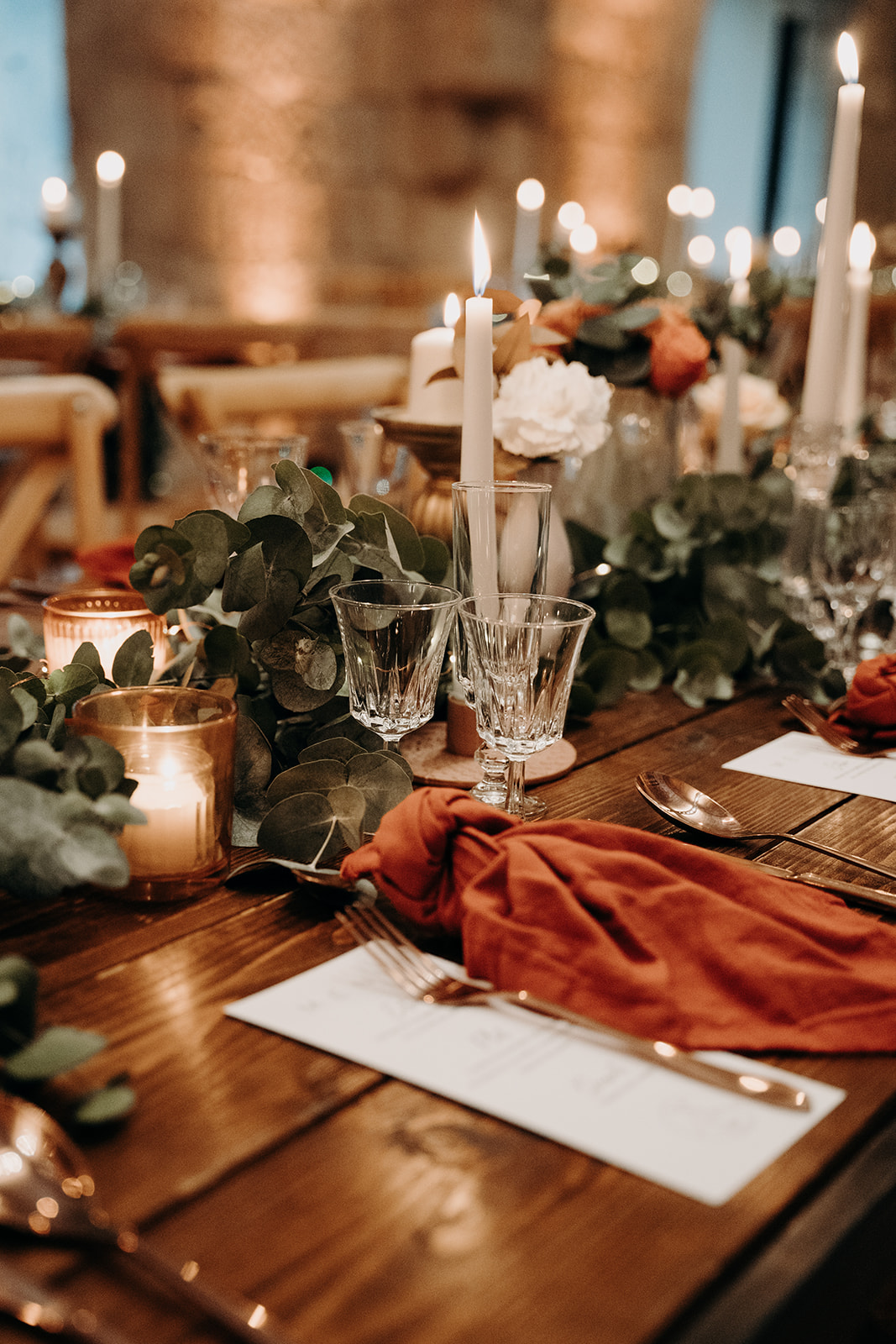 En ce qui concerne la décoration florale, c’était déjà tout trouvé ! Une guirlande d’Eucalyptus familial en guise de chemin de table accompagnée de soliflore contenant de jolies fleurs dans les tons terracotta.