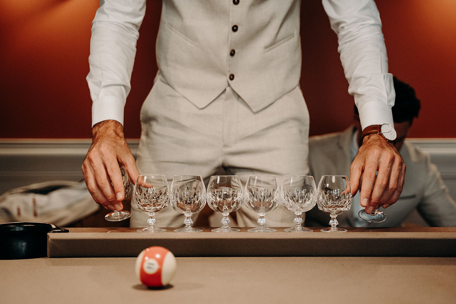 En premier lieu, imaginer vous et votre bande de potes vous préparer pour votre mariage dans un pièce décoré dans l’esprit d’un fumoir d’époque. Ainsi donc, beaucoup de bois, une bibliothèque, un service à Whisky et un billard. En d’autres termes, c’est bien là que B s’est préparé pour dire oui à sa belle. Aussi, les garçons n’ont pas manqué l’occasion de trinquer au futur marié et de faire une partie de billard ! Ambiance détente assurée.