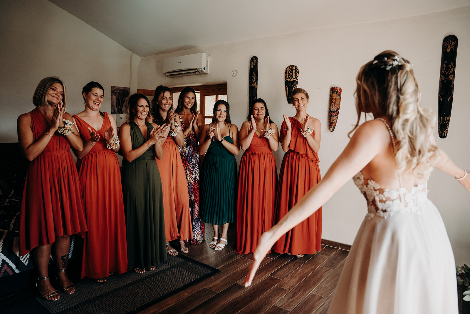 Ensuite, voyons-le coté de la belle A. Elle de son côté, avait loué un gîte dans le village voisin. Bien sûr, elle était entourée de toute sa bride team ! Ici, l’ambiance était plus cosy, plus douce, mais toujours autant d’émotions pour notre belle et sa team. Ainsi, elle a partagé une coupe de champagne avec ses amies et il est déjà temps d’enfiler sa robe de princesse.