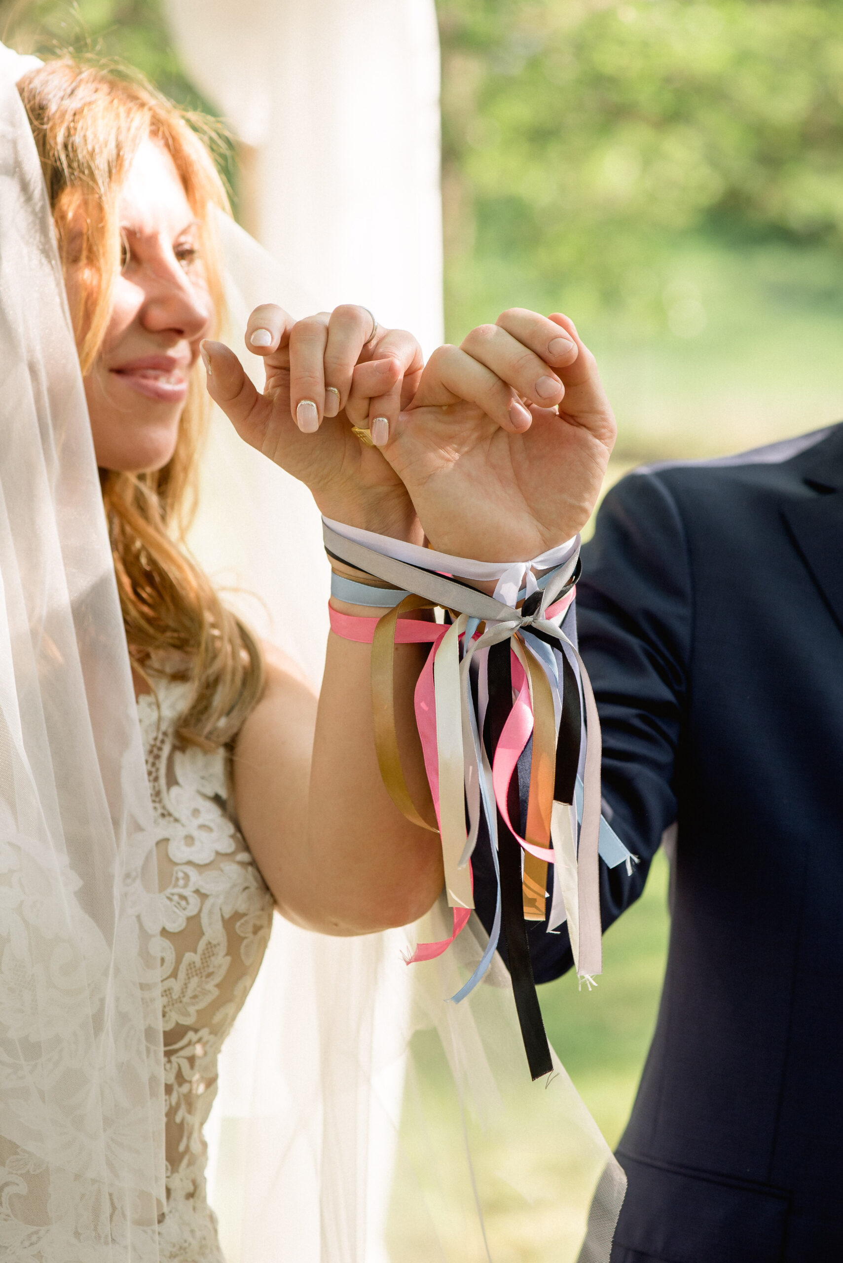D’origine anglo-saxonne, le rituel connu sous le nom de « handfasting » ou « rituel des mains liées » implique de lier les mains des mariés avec des rubans colorés ou des ficelles pendant la cérémonie. Effectué par l’officiant ou les invités, ce geste symbolise le lien indéfectible entre les futurs époux. Traditionnellement, 13 rubans de couleurs différentes sont utilisés, chacun portant une signification particulière. D Day wedding planner Béziers vous propose également de demandé a certains de vos proches de venir noué un ruban autour de votre poignet en effectuant un vœux.