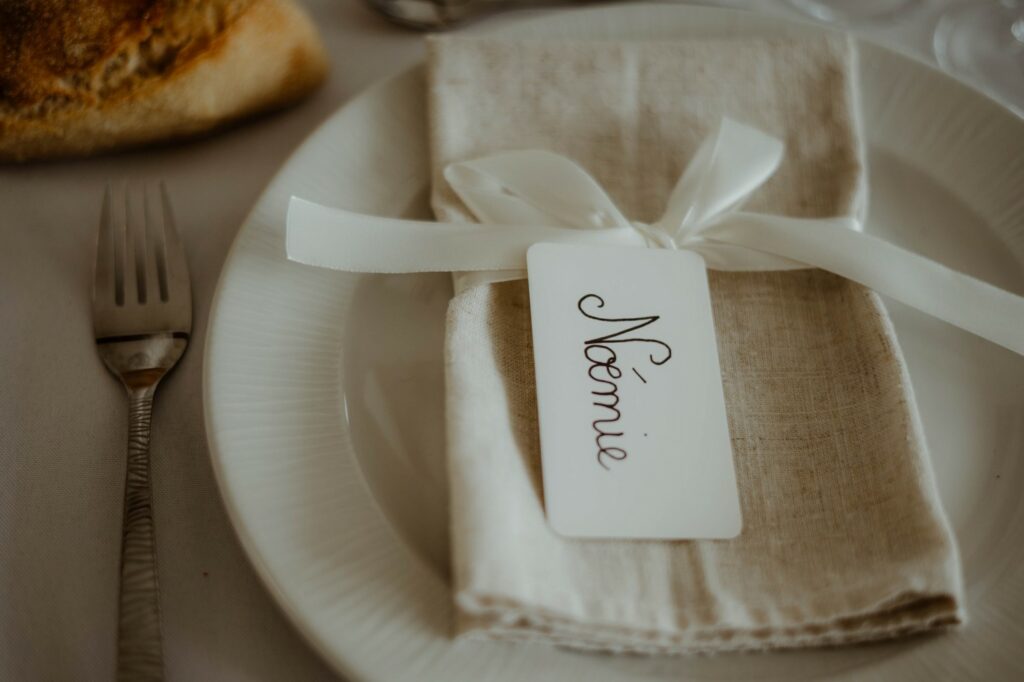 Afin de peaufiner les derniers détails, D Day Wedding Planner Bordeaux a mis en place les petits éléments de décoration : marque places délicatement noués de jolis rubans et bougies.
